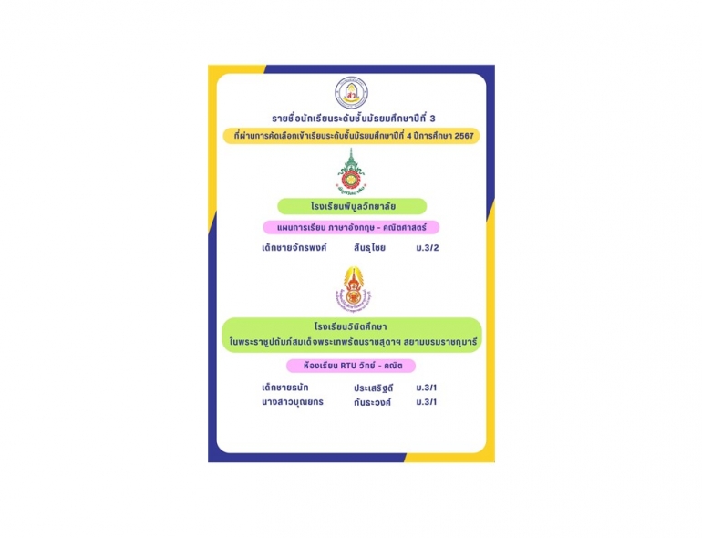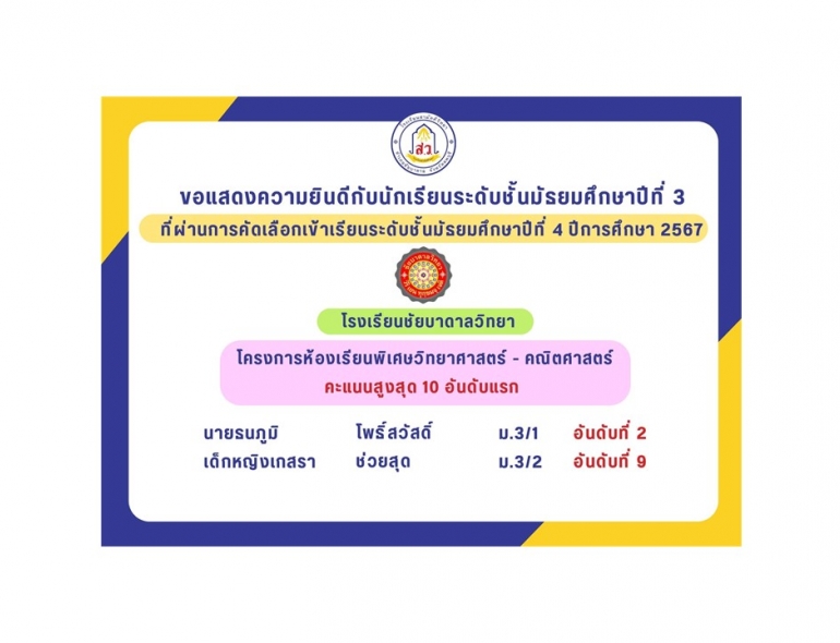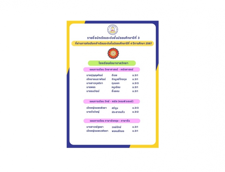 โรงเรียนสามัคคีวิทยา ขอแสดงความยินดีกับนักเรียนที่ผ่านการคัดเลือกเข้าเรียนระดับชั้นมัธยมศึกษาปีที่ 4 ปีการศึกษา 2567 ดังนี้
